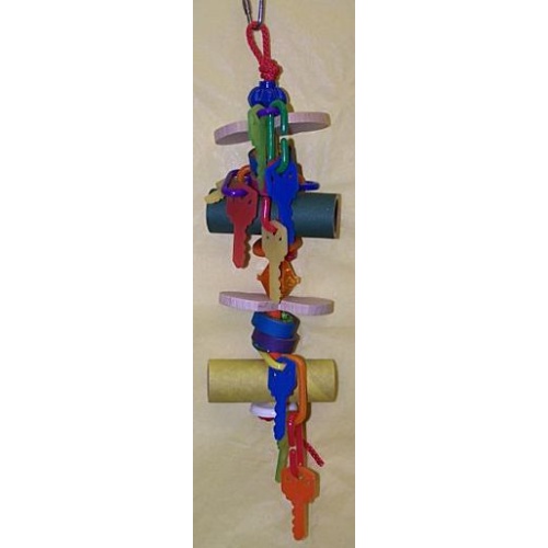 Double wood heart chewing pieces, birdie bite chewing tubes, load of plastic keys, birdie bites, beads, baubles and links hung on pauly rope with a pear link. Plenty of chewing on this toy!