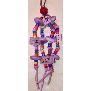 A mixture of hard and soft wood, beads and baubles strung on vegetable tanned leather strips. Lots of chewing here.