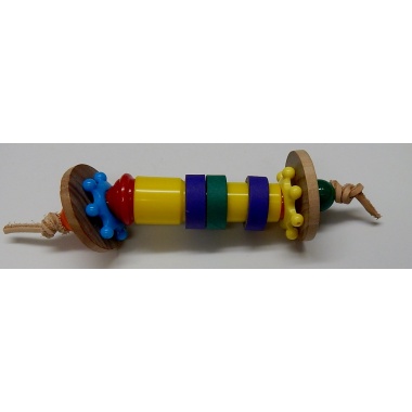 This foot toy has a plastic pipe as its base with little beads inside to make a little noise while shaking!!  Plastic beads, wooden circles and bagel bites to chew on.  There is a little bit of everything here all tied together with a strand of vegetable tanned leather.